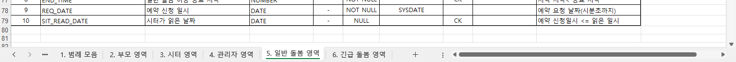 먼저 크게 범례/부모/시터/관리자/일반 돌봄/긴급 돌봄 의 6가지 분류로 영역을 나누었다. 그리고 각 영역에 해당하는 테이블명을 오름차순으로 정렬했다. 테이블에 대한 설명을 함께 작성해 어떤 영역에 어떤 테이블이 존재하는지를 파악하기 쉽게 정리했다.