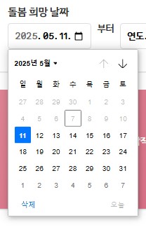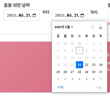 - 1차 필터 설정 시 돌봄 희망 시작일 자동 변경 기능 구현 → 돌봄 희망 시작일(ex.2025-05-30)보다 이른 날짜(ex.2025-05-21)를 종료일로 선택 시, 돌봄 희망 시작일이 종료일과 동일한 날짜(ex.2025-05-21)로 자동 변경