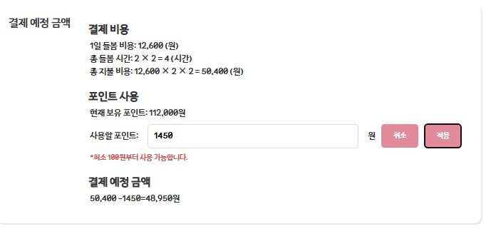 - 결제 예정 금액 계산 기능 구현 → 시터 등급, 돌봄 일수, 돌봄 시간, 기본급, 수수료 등 반영